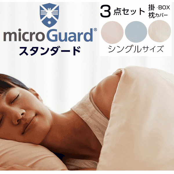 ミクロガード スタンダード 布団カバーセットサイズ(シングルロング)掛け布団カバー:150×210cmボックスシーツ:100×200×28cm 枕カバー:45×65cm色 ベージュ ピンク ブルー組成ポリエステル:100% メーカー:帝人フロンティア 日本製ミクロガードはカバーをかけるだけで防ダニ対策。