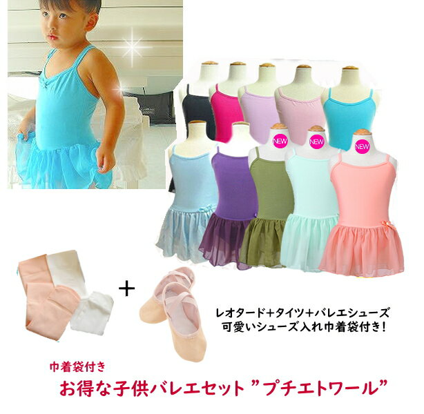 バレエ レオタード 子供 3点セット プチエトワール レオタード+タイツ+バレエシューズ+巾着袋付き キッズ 子供 【送料無料】(115〜155cm)(衣装 ジュニア バレエ用品 子ども レッスン セット スカート付き 新体操 ) あす楽